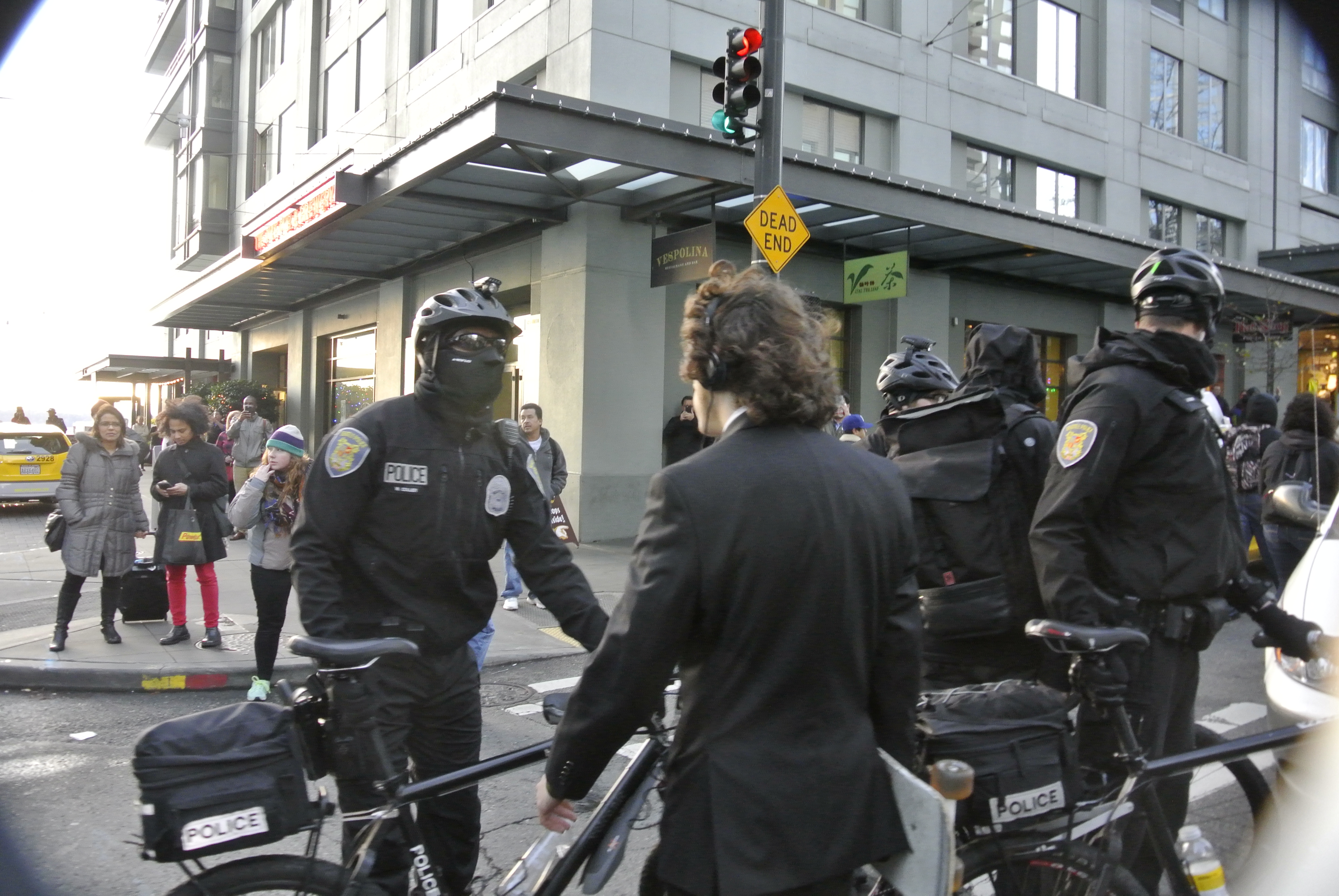 Earlier this December, I went to the King County Jail for one of our people who was scheduled for a bail hearing after the individual was arrested leaving a march alone. The charge was burglary, but there was not even enough evidence to set bail and the individual was released without bail or charges being filed. The individual was, it seems, arrested just because of their involvement in the demonstration.