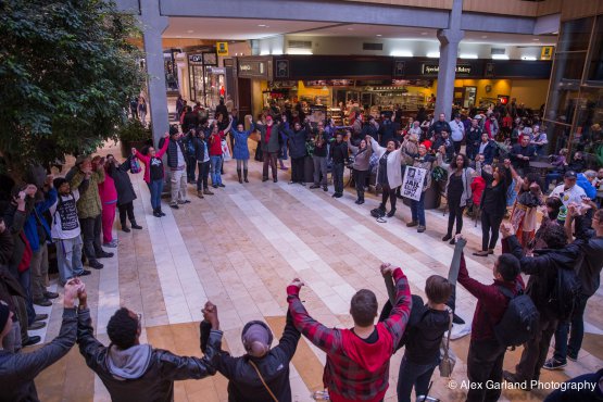 A perfect example of this was at the demonstration at Bellevue Square when a woman with a child who was sitting in the area where The People gathered to sing, joined the demonstration with her young son. The People were singing “Which side are you on my friend, which side are you on? Justice for Mike Brown, is justice for us all” in the center of the mall. After the police, decked out in full riot gear encircled the demonstrators, they made a plea to the white woman from Bellevue, notifying her that they were about to arrest everyone in the demonstration and warning her that she should take her son away before they began. Instead of running away and allowing an unjust action to occur, she grabbed her son and entered into the center of the circle of this peaceful demonstration. It was both heartwarming and inspiring to see that someone who no one knew believed in fighting for justice so much would not conceal even her son from the harsh reality of oppression and suppression.