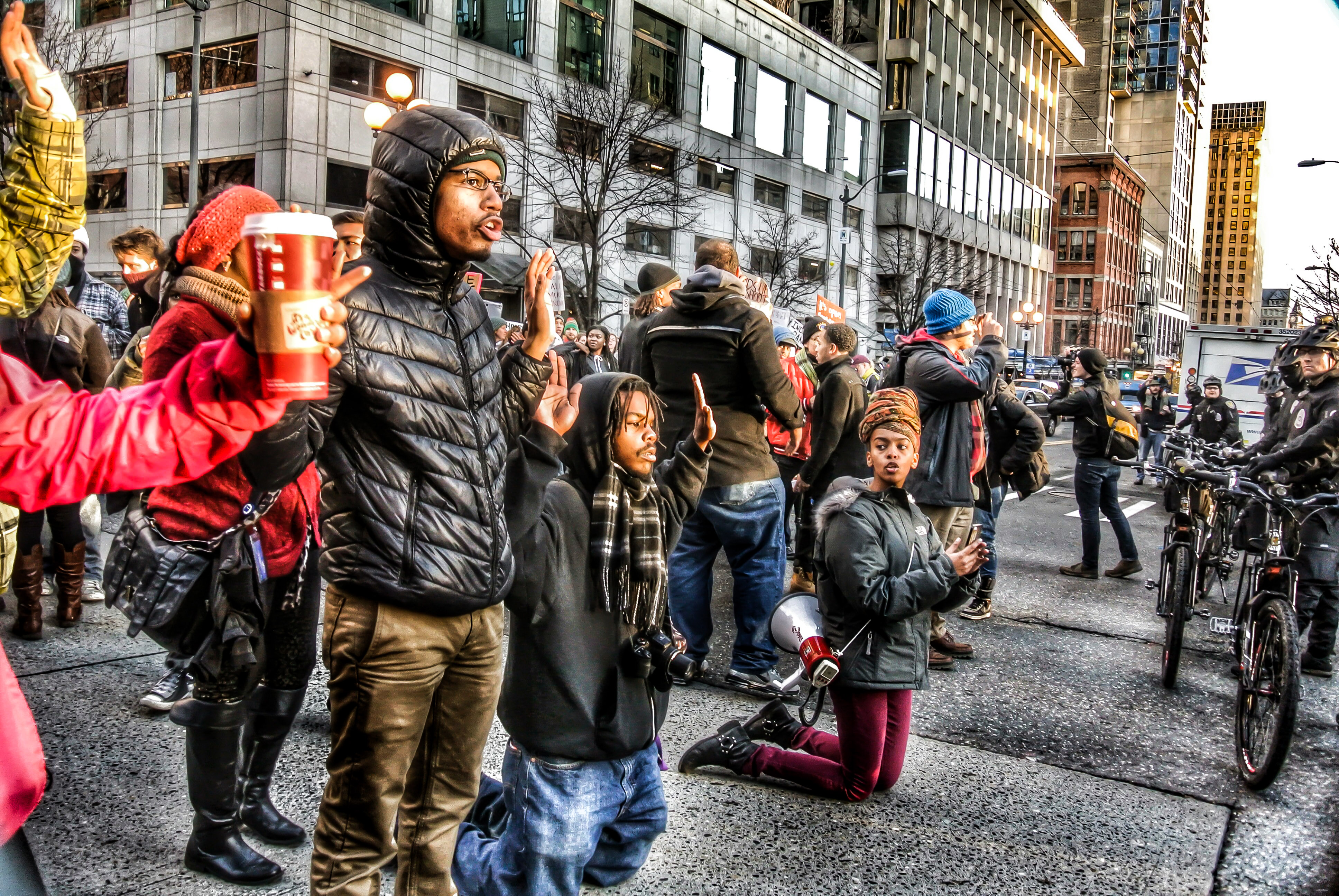 The beautiful thing about this movement to end police brutality and by corollary to end the system which buttresses mass incarceration is that it has bridged culture, class, nationality, sex, religion, age, gender identification, race, ethnicity, political ideologies, and color. In the marches here in Seattle and around the United States, at any point that you turn around to look at the people putting their bodies on the line to ensure that Civil Rights are achieved you will see someone from any of innumerable walks of life and backgrounds. The beauty of it is that as different as we all are, we all believe that people should be treated fairly and equally.