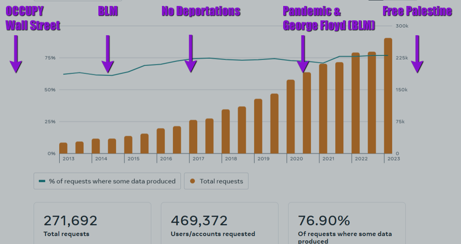The graphic above details the growing number of law enforcement requests to and the number of request satisfied over the decade between 2013 and 2023 by Facebook, which many of us aptly call FedBook. Other social media platforms have experienced similar trends and share similar information. Google is also notorious for this and so is Zoom. It is not only social media that is doing it. The authorities have found internet platforms such as these to be literal treasure troves of information that people readily volunteer.